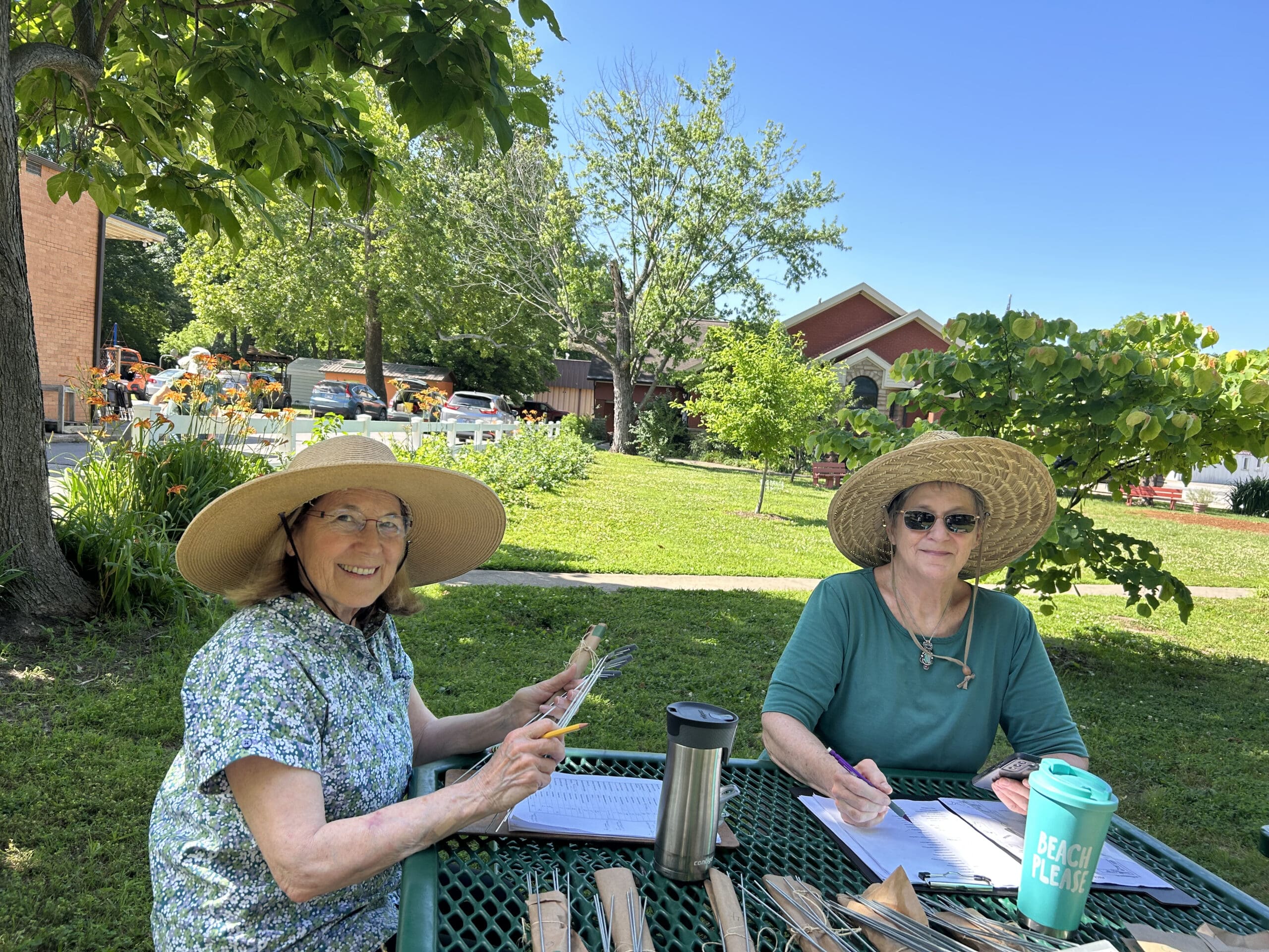 Washington County Master Gardeners Karen Hanna-Towne and Susan Snell work on a plant labeling project at Mock Park in Prairie Grove. Photo by Chris Bell.